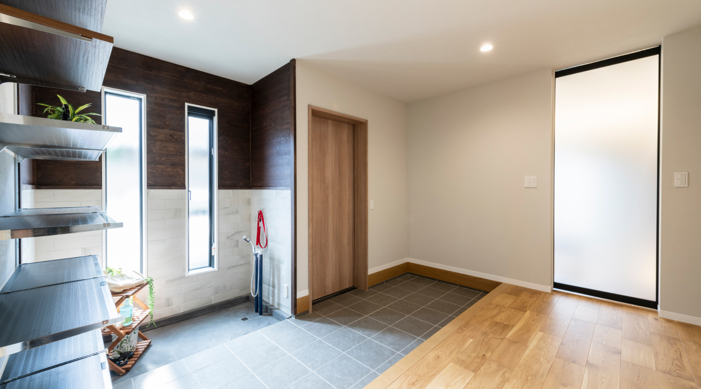 帰宅時の手洗いや、ワンちゃんの足洗場など、広い土間空間を活かした便利なスペースに。