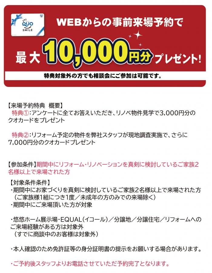 | 備考 | 【特典】事前ご来場予約でQUOカード最大10000円分プレゼント! |