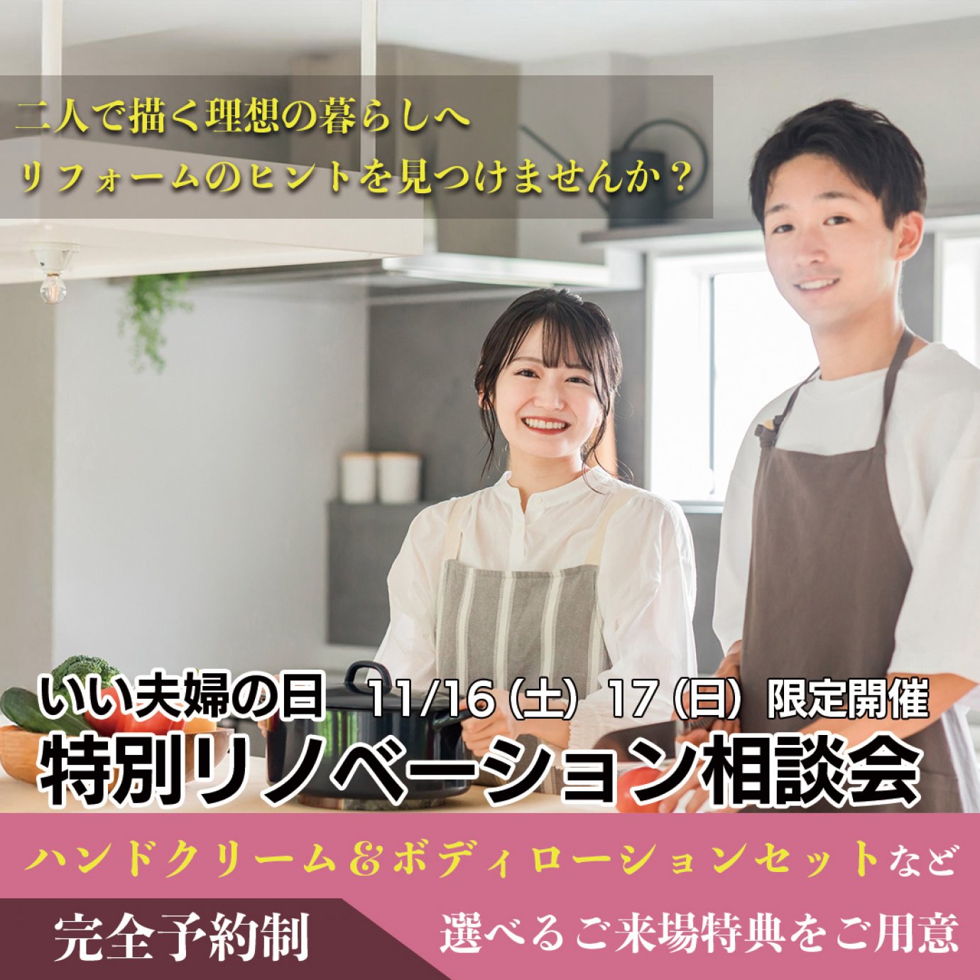 「いい夫婦の日」にぴったりな、二人で過ごす快適な住まいづくりを、 実際のモデルハウス・ショールームで感じてみませんか? リノベーション空間をその目で見て、触れて、体感することで、 お二人の理想の住まいが見えてくるかもしれません。 この機会にぜひ、お気軽にご来場ください!