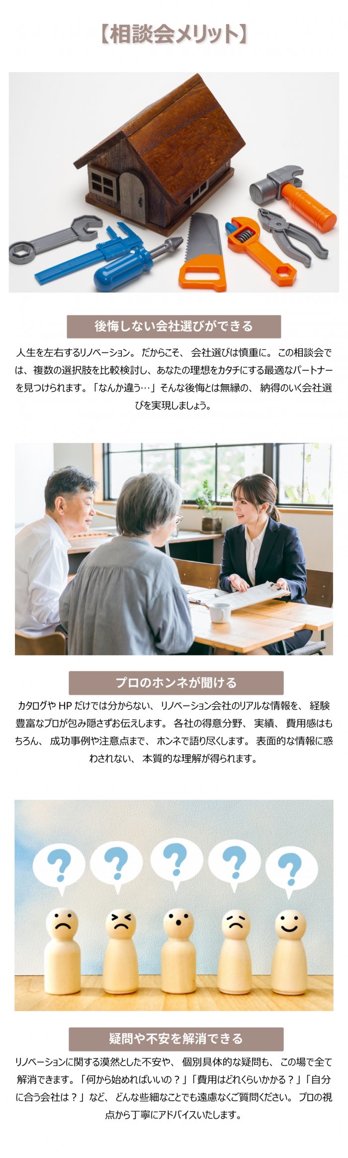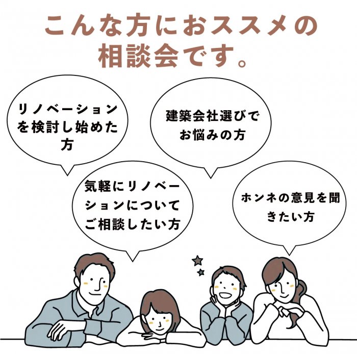 本相談会では、リノベーション業界のリアルな情報を、経験豊富なプロが徹底解説。各社の強み・弱み、事例、費用まで、ホンネで語ります。