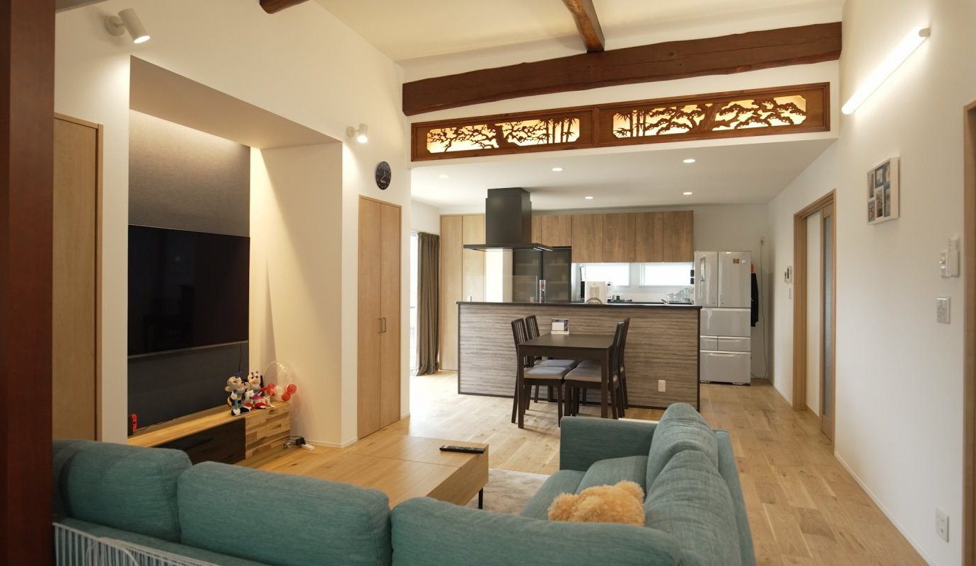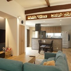 特にリビングの「力強い現しの梁」や「松竹梅の欄間」を絶妙に残すなどリノベーションにしか出来ない思考と技術の融合した家が完成しました。