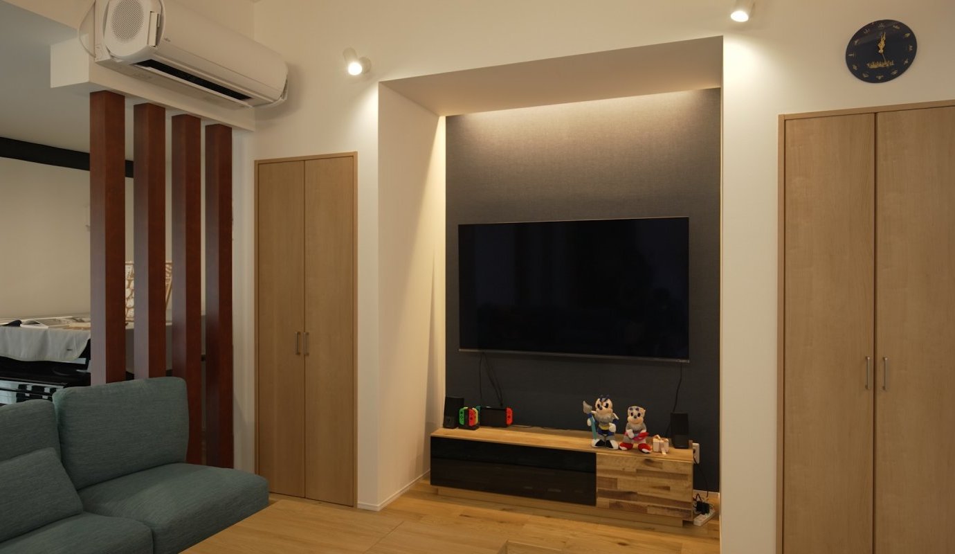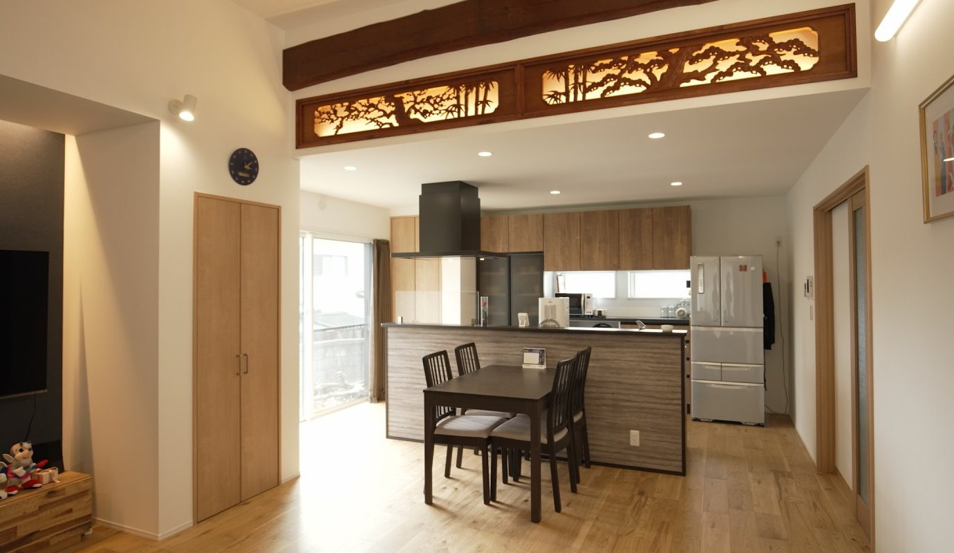 以前の設計図で分かった太い梁を活かし、見える化したことで、おじい様が残された家族を守る力強さを感じるそうです。また、今ではなかなか目にすることも無くなった職人さん手作りの欄間も松竹梅が表現されていて、ご家族のさらなる幸せをお祝いしているかのようです。その欄間には間接照明が施され、夜になるととってもムーディーな雰囲気になって、お酒がさらに美味しく感じるそうですよ。