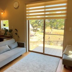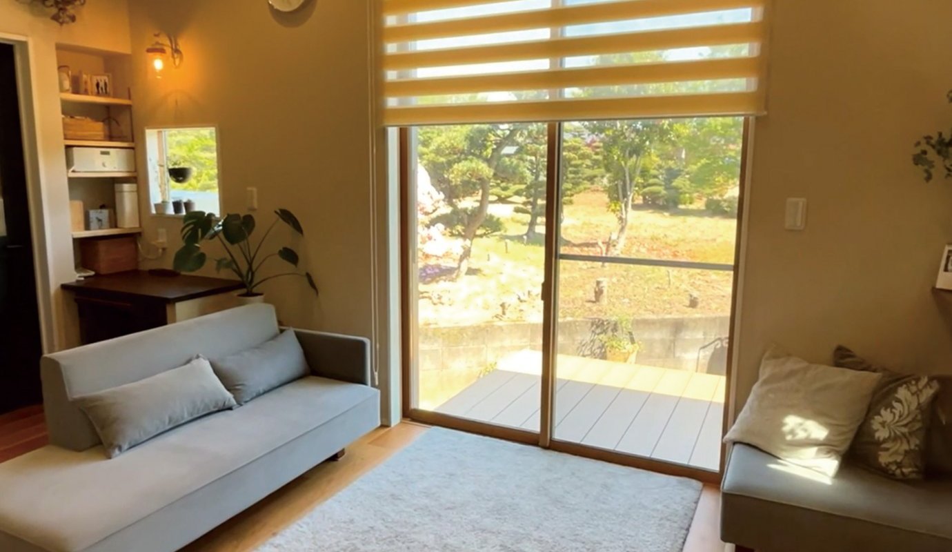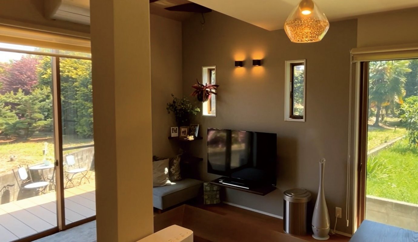 家族全員が集まるリビングには出窓があったのですが、まずここを大改造。大きな掃き出し窓を設け、外にはウッドデッキを取り付けました。リビングからウッドデッキへ自由に出入りができ、内外を一体化する開放的なプランです。この窓から見える景色にもこだわっています。また、間接照明とブラケットライトで、落ち着いた雰囲気のリビングになっています。