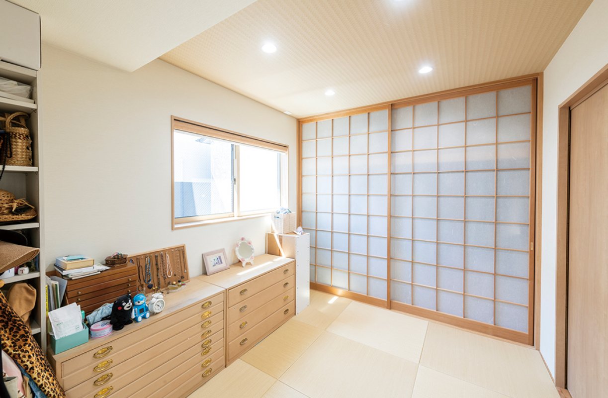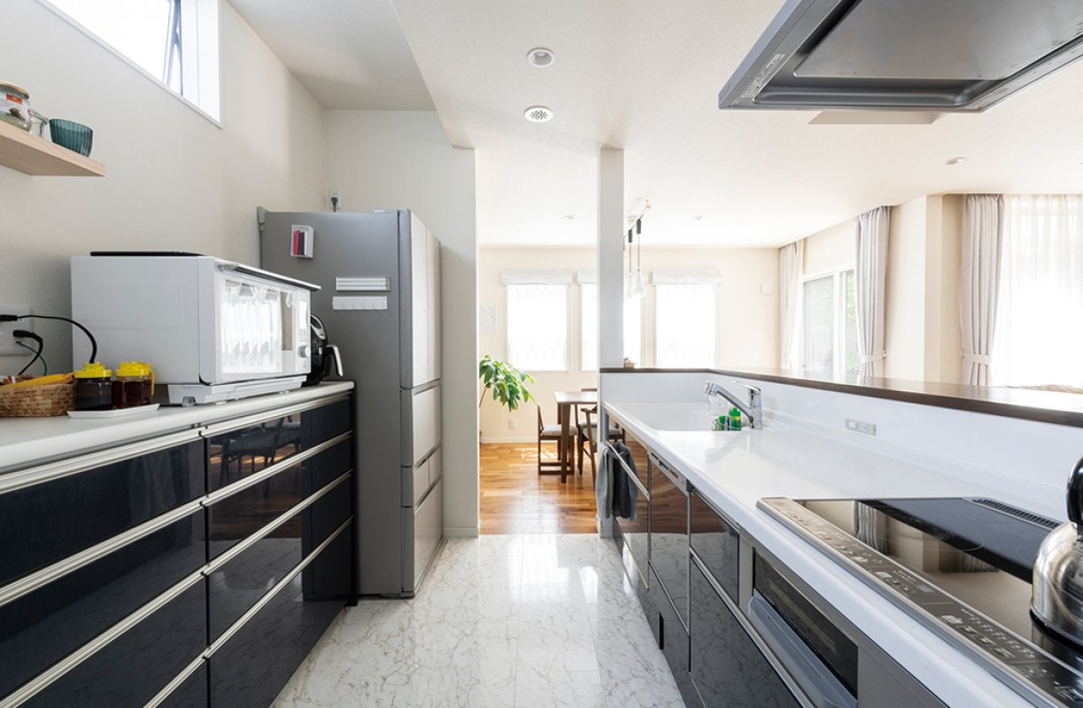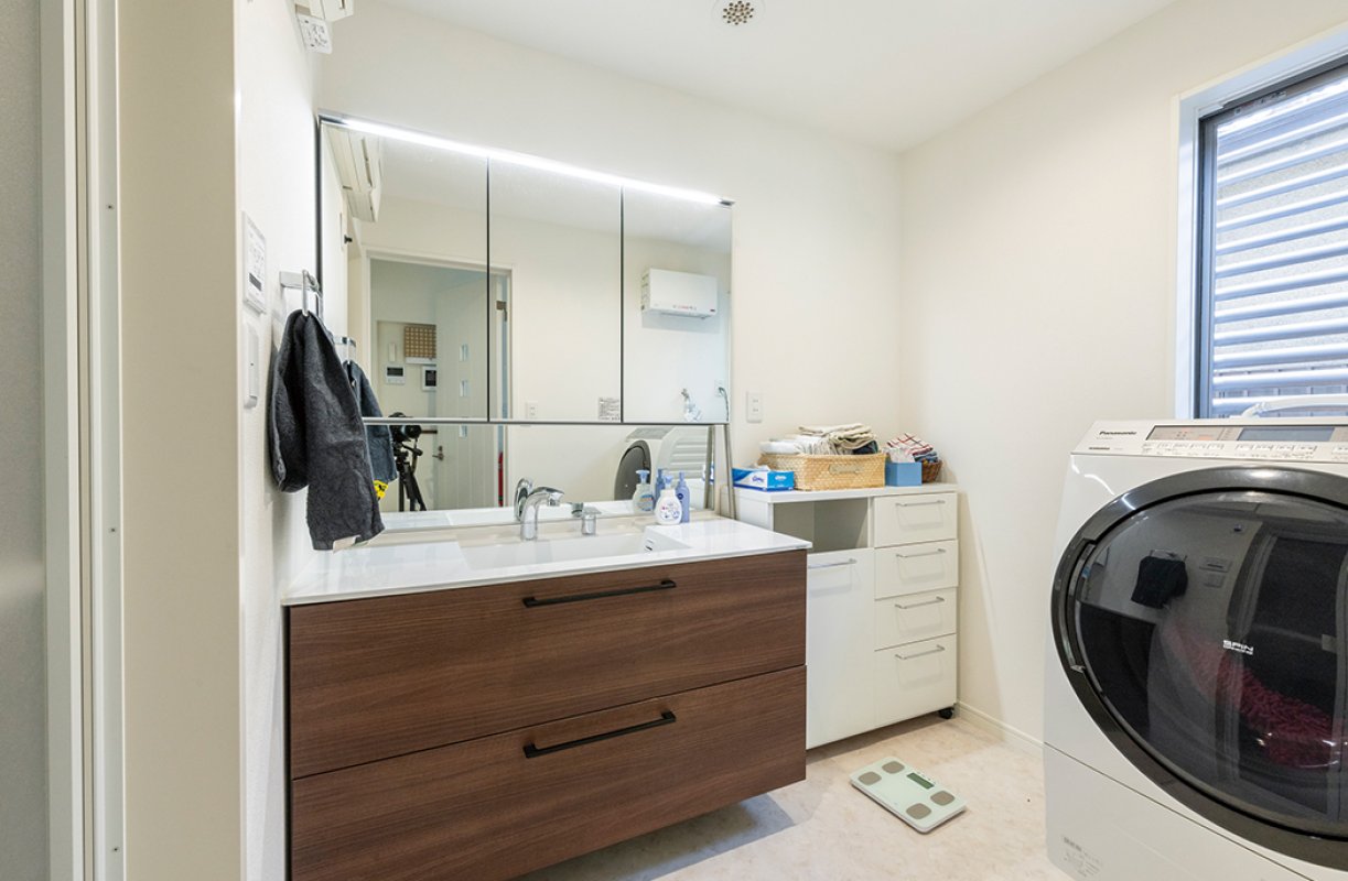まず、主寝室を2階に移動することで、1階に広々としたLDKを確保。これにより、リビングやダイニング内に収納スペースを設けることができました。キッチンにはカウンターやカップボードを備え、食器や調理道具をスムーズに収納できる工夫を施しました。さらに、洗面脱衣室や各部屋にも適切な収納を配置し、必要な物がすぐ手に取れるようにしました。