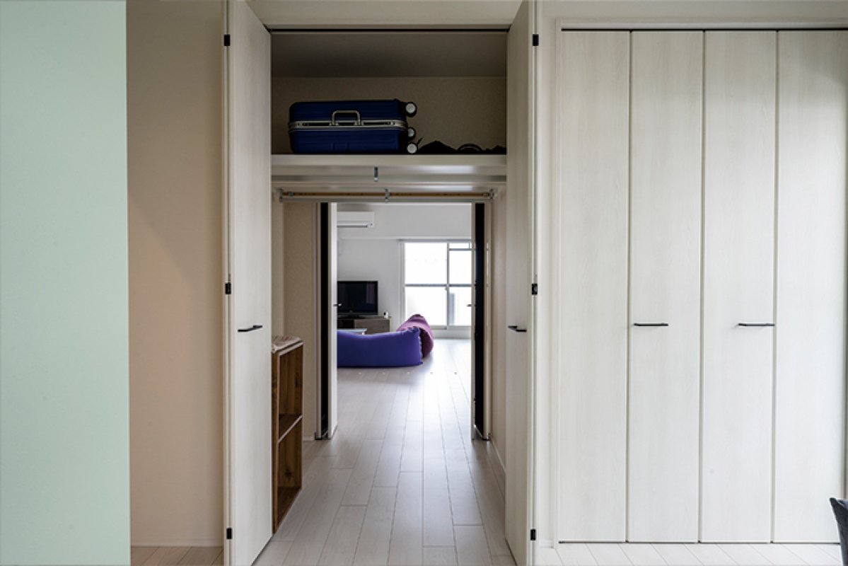新設されたワイドなシューズクロークは、靴や季節のアウターを整理整頓するのに最適なスペースとなりました。同時に、リビングに追加した可動棚付きの収納スペースは、生活に合わせて自在に変えることができ、使い勝手を向上させました。