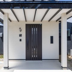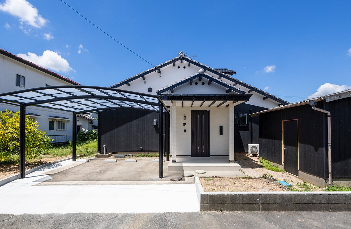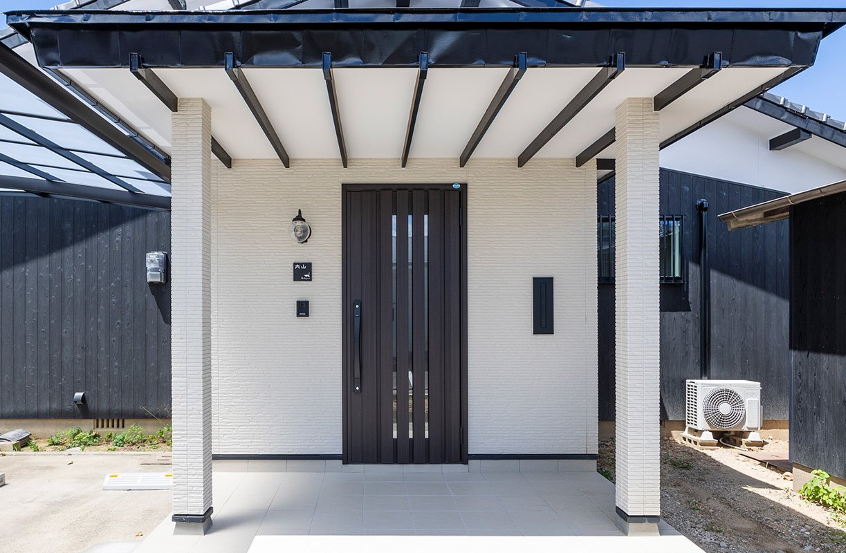 外壁は焼杉のブラックを基調にし、うきは市吉井町の白壁をイメージしたホワイトのサイディングをアクセントに加えたことで、シックで洗練されたモノトーンの外観になりました。