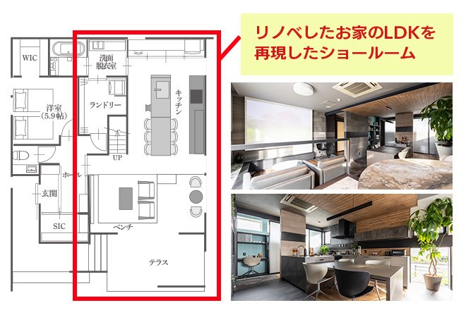 このショールームは、実際にリノベーションされたお家のLDKをリアルサイズで再現しています。
