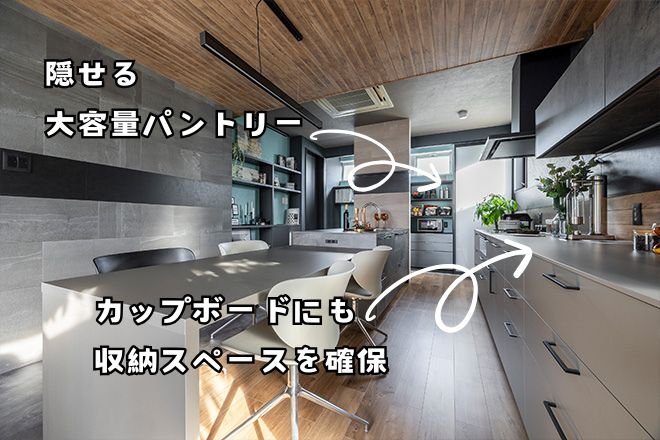 キッチンには、冷蔵庫や家電、調理器具を隠して収納できる大容量のスペースを確保し、生活感を感じさせません。