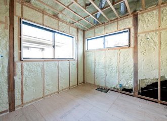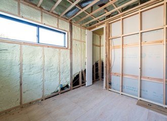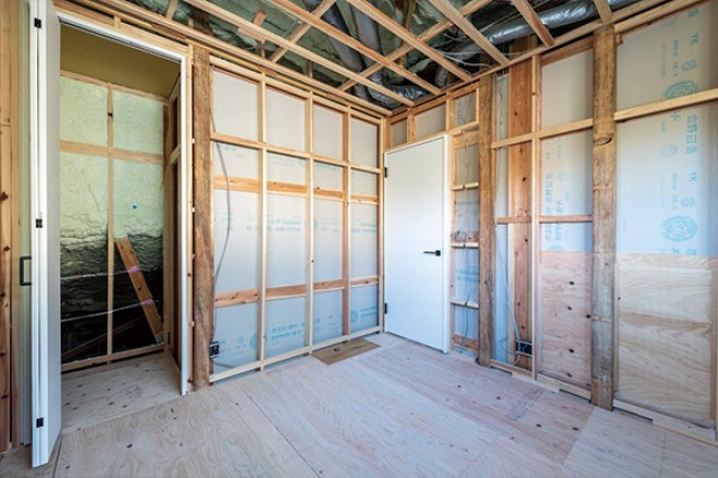 こちらでは、壁を仕上げずに柱や断熱材がそのまま見える状態になっており、耐震性や断熱性の高さを直接確認できます。