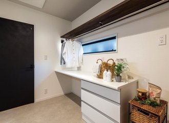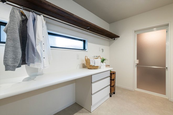 洗濯機の隣には作業カウンターを設け、すぐに洗濯物を干せるように物干しパイプも完備しています。