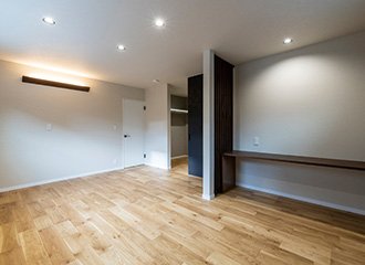 10畳の広さを持つ主寝室は、間接照明と造作カウンターで落ち着いた空間に仕上げました。