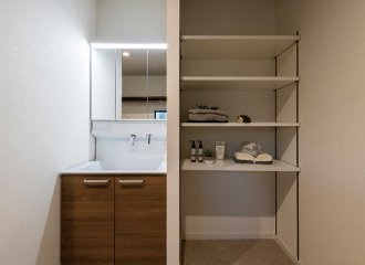 三面鏡の洗面化粧台は、収納力たっぷりで、毎朝の準備がスムーズに。