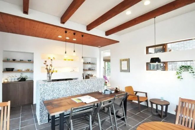 タイル張りの床と見せ梁、天井にも一部、木を使って「おうちカフェ」的な空間に。