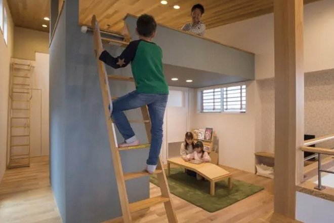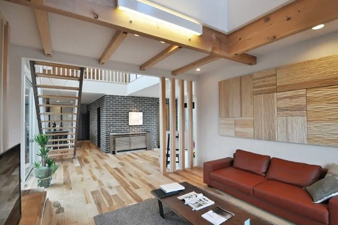 木肌の色の違いをアクセントにした木張りの天井。空間を自由にかつ快適に使える外断熱だからこその使い勝手の良いロフトも人気。