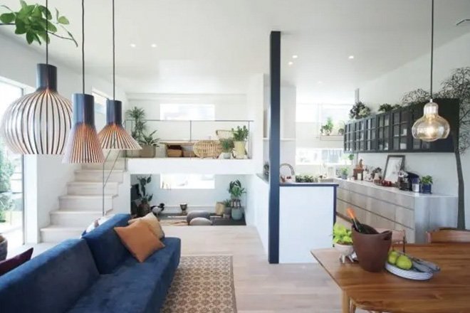 食卓を中心にデザインされた設計。秘密基地のような空間とスキップで実現したリラックススペースにも繋がった、現実的な広さでシンプルな間取り。
