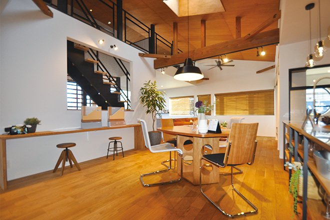 リビングは現し梁と高い天井が特徴で、広々とした開放感が魅力です。
