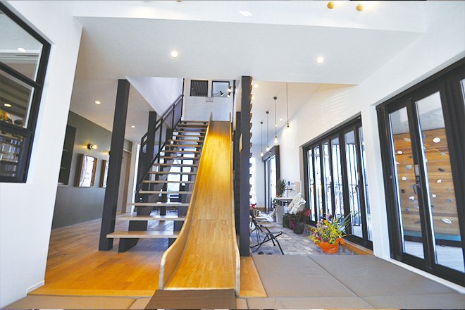 さらに、ジェットコースターのようなすべり台や秘密基地のようなロフトなど、子供たちが喜ぶアイデア満載の空間も魅力。