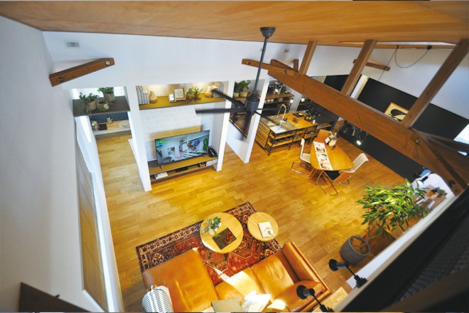 天井の高いリビングは現し梁と高い天井で、広々とした開放感を提供します。